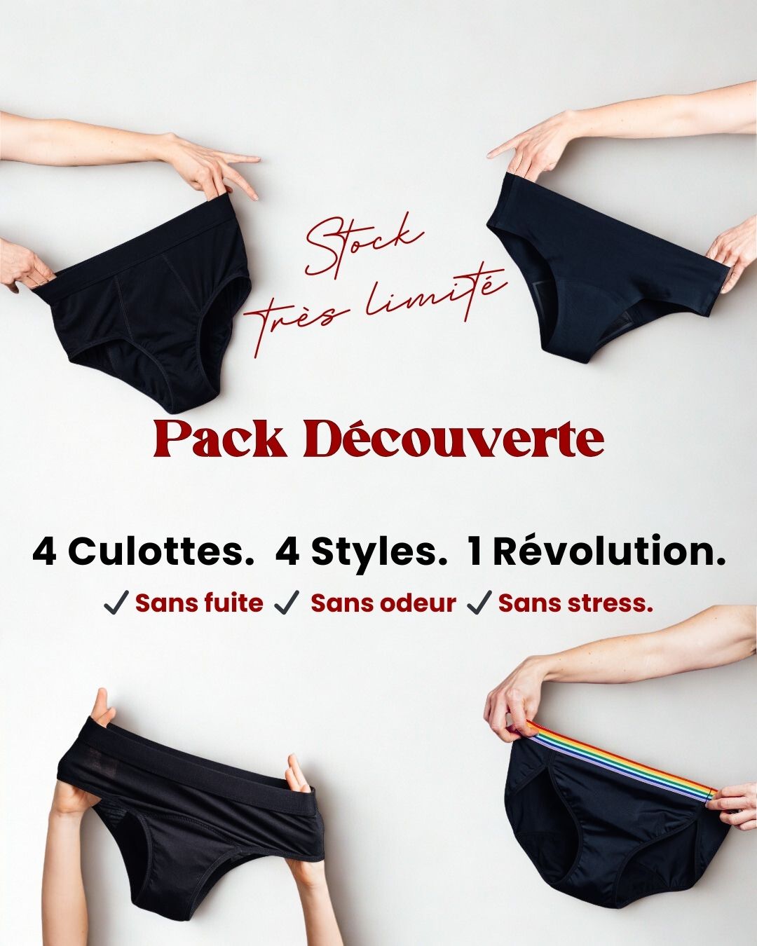 4 culottes menstruelles différentes parce que notre humeur change et notre flux aussi. Découvre le style, le confort et l'efficacité dans ce pack à durée limitée.